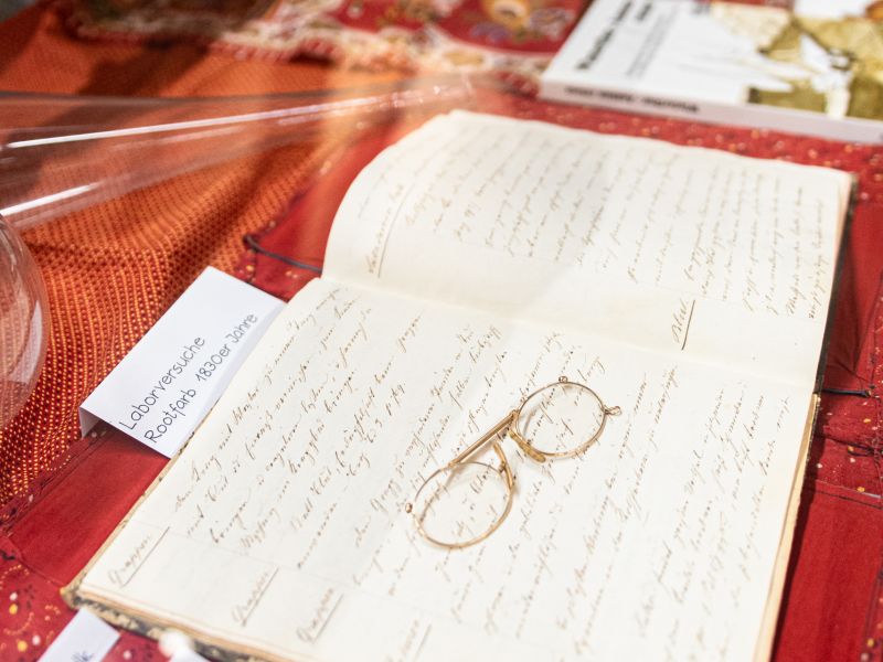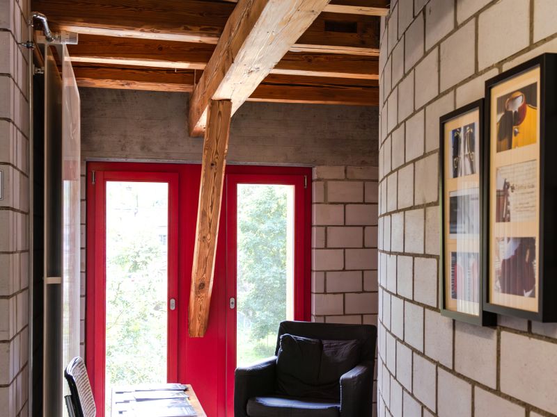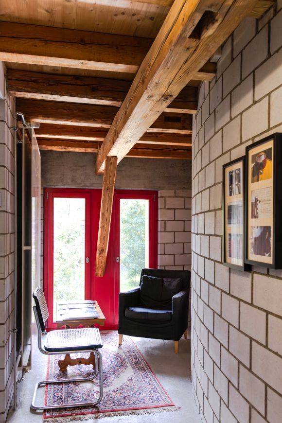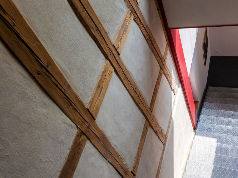 Wer genau hinschaut, entdeckt da und dort die Farbe Rot am Gebäude: Die roten Fensterrahmen und der rote Eingangskubus sollen an die ursprüngliche Bestimmung des Turmes als Tröckneturm für rot gefärbte Tücher erinnern.